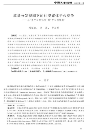 刘征驰教授、周莎博士后以及中国人民大学经济学院李三希教授合作撰写的学术论文《流量分发视阈下的社交媒体平台竞争——从“去中心化社交”到“中心化媒体”》在《中国工业经济》2022年第10期刊出。《中国工业经济》期刊由中国社会科学院工业经济研究所主办,是我国产业经济学领域的权威学术期刊。