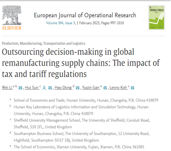 李巍教授与英国谢菲尔德大学孙蕙博士、英国南安普顿大学董浩博士、厦门大学甘玉琴硕士和英国谢菲尔德大学Lenny Koh教授合作论文“Outsourcing decision-making in global remanufacturing supply chains: The impact of tax and tariff regulations”在European Journal of Operational Research的2023年第3期刊出。European Journal of Operational Research为运筹学与管理科学领域国际权威期刊,ABS评级四星期刊。