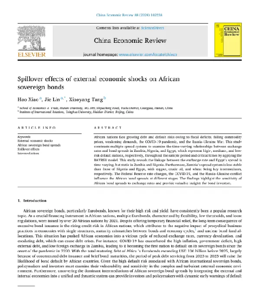 肖皓教授、博士生林婕、清华大学唐晓阳教授合作撰写的学术论文“Spillover effects of external economic shocks on African sovereign bonds”被《China Economic Review》(CER)录用。CER(SSCI Q1,IF=5.2)是一本专注于中国经济研究的国际学术期刊,致力于发表与中国经济发展、政策和市场相关的高质量研究论文,在经济学界享有良好声誉和广泛认可度。
