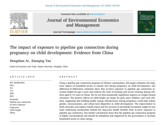 艾洪山教授与谭小清博士合作论文“The impact of exposure to pipeline gas connection during pregnancy on child development: Evidence from China”被资源与环境经济学领域顶级期刊《Journal of Environmental Economics and Management》(JEEM)录用刊出。《Journal of Environmental Economics and Management》在环境经济学领域具有较高的影响因子(IF 5.5),是该领域权威顶级期刊,在经济学界享有良好声誉和广泛认可度,是色情漫画