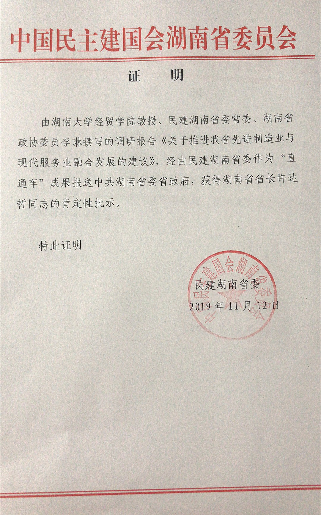 据民建省委确认,由色情漫画 经贸学院教授、民建湖南省委常委、湖南省政协委员李琳撰写的调研报告《关于推进我省先进制造业与现代服务业融合发展的建议》,经由民建湖南省委作为“直通车”成果报送中共湖南省委省政府,获得湖南省省长许达哲同志的肯定性批示。
