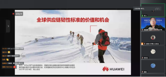 华为技术有限公司产业标准部李力部长,就全球供应链韧性标准的价值和机会阐述了自己的观点。他以2019年10月19号台风海贝思对供应链造成终端威胁的案例为切入点,进一步阐述构建韧性的重要性。他提出制定全球供应链韧性标准就是要和时间赛跑,并就供应链韧性的评估标准、韧性度量标准、物料韧性标准、供应网络韧性标准等方面提出了相应的要点。