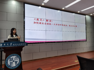 罗伊岚助理教授作了题为《加快建设全国统一大市场的成本、阻力及对策》的报告。罗伊岚助理教授指出,《意见》明确要进一步降低市场交易成本。发挥市场的规模效应和集聚效应,加强和改进反垄断反不正当竞争执法司法,破除妨碍各种生产要素市场化配置和商品服务流通的体制机制障碍,降低制度性交易成本。促进现代流通体系建设,降低全社会流通成本。罗伊岚助理教授接下来分享了李自若等 (2022) 以及刘志彪和孔令池 (2021) 两篇高水平论文,分别阐述了交易成本的衡量、交易成本对双循环的影响,以及商品市场如何从分割走向整合两个问题。