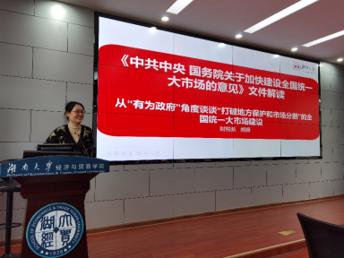 阙薇副教授作《从“有为政府”角度谈谈“打破地方保护和市场分割”的全国统一大市场建设》的报告。阙薇副教授认为,在“百年未有之大变局”的全球复杂多变局势下,我国出口导向的高速增长模式已经越来越不可持续,需要从出口为主转向扩大内需,建立全国统一大市场,构建发展新格局。因此,《意见》明确指出要建设高效规范、公平竞争、充分开放的全国统一大市场,这需要从建立统一市场制度规则、打破地方保护和市场分割、打通经济循环关键堵点、促进商品要素资源畅通流动等诸多角度共同发力。阙薇副教授提出了“有为政府”建设全国统一大市场的三点建议。第一,构建后勤型、服务型政府,实施财政精准调控。第二,在国家治理范畴方面明确央地政府的财权与事权关系。第三,调整对地方官员的监督考核制度,提升政府治理能力。