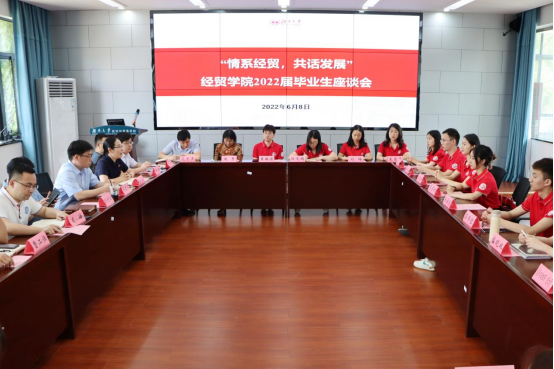 在经贸大楼201会议室召开主题为“情系经贸,共话发展”的2022届毕业生师生座谈会。学院领导班子、各系主任、学院相关辅导员和教务秘书与13名毕业生代表参加会议。会议由院党委副书记李曼主持。