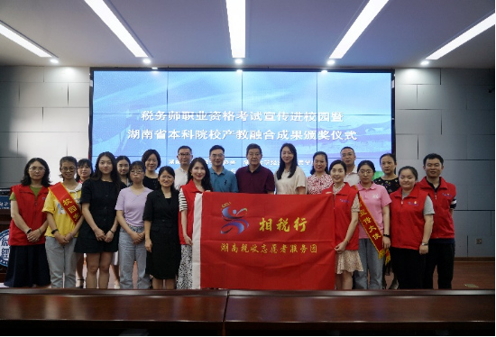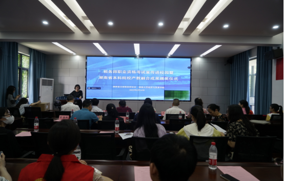 联合举办2022年湖南省本科院校产教融合成果暨全国本科院校纳税风控案例大赛湖南赛区颁奖仪式,活动以线上线下相结合的形式进行,主会场设在经贸学院行政楼201会议室,湖南其他院校通过腾讯会议平台设置分会场。