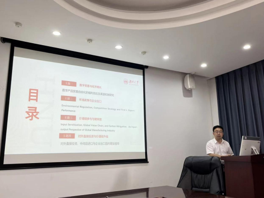 祝树金书记从数字贸易与经济增长、环境政策与企业出口、价值链参与与碳排放、对外直接投资与价值链升级四个方面详细介绍了相关研究。杨湘黔老师重点介绍了关于信息设计和稳健机制设计的相关工作论文,并指出了机制设计的一般性理论应用于全球价值链研究的可行路径。雷罗宇凡老师重点介绍了关于假设检验和空间计量方法相关的工作论文,并提出将空间分析方法应用于世界经济相关研究的构想。王腊芳老师重点介绍了关于政府信息披露与环境保护,以及全球价值链与碳排放等问题的相关研究。何昱老师介绍了协调三次分配促进共同富裕的工作论文,并探讨了可计算一般均衡等方法如何应用于世界经济相关课题研究。华岳老师重点介绍了全球价值链与环境污染、绿色区位导向性政策与外商直接投资等相关研究。