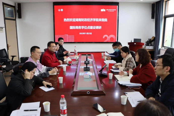 就国际商务专业学位点建设与人才培养工作进行调研交流,院研究生工作主管肖皓副院长和国际商务学位点负责人谢锐副院长以及部分专业教师代表参加座谈。