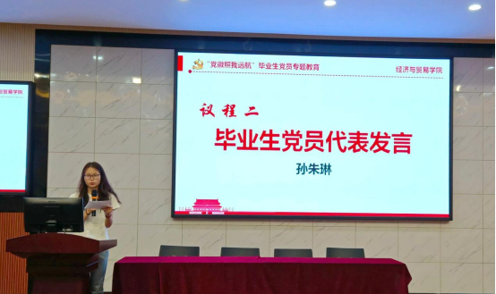 优秀毕业生党员代表孙朱琳分享了自己在遇到的迷茫与焦虑时如何确定前进的方向,表示正是身边的优秀榜样们激励她不断前行,并勉励毕业生们以实际行动践行“将青春之花绽放在祖国最需要的地方”。