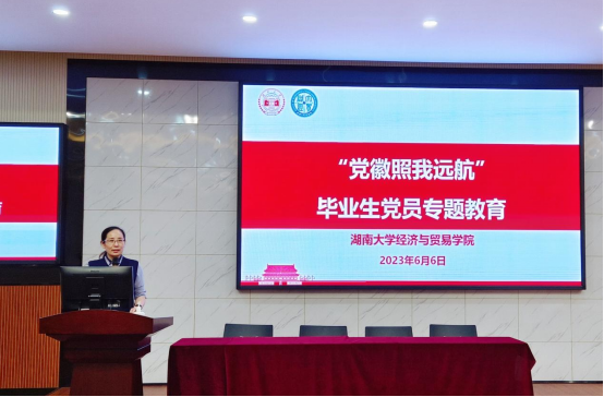 “党徽照我远航”毕业生党员专题教育活动在老食堂二楼大报告厅举行。学院党委书记祝树金、党委副书记李曼、毕业生辅导员田丽靖、肖遥出席,李曼老师主持,全体毕业生党员参加。