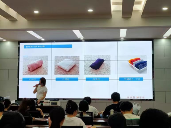 收纳整理实践专题——聚焦学生自理劳动能力的提升,邀请专业收纳师为同学们开展收纳整理知识沙龙,现场教授寝室空间收纳技巧。同学们在收纳师的指导下纷纷开展实操,现场氛围热烈。
