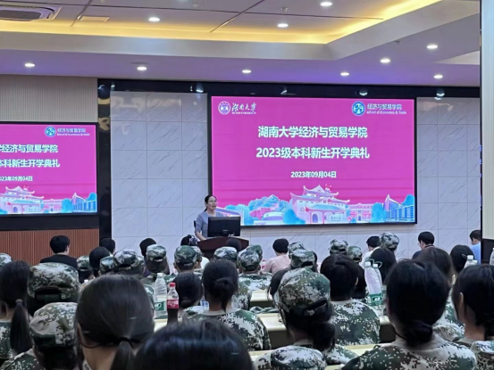 院长侯俊军代表学院热烈欢迎2023级本科新生加入经贸大家庭,期待同学们在未来几年,做一个勤学而有专业所长、优秀且有责任担当、自信且能无惧挑战的经贸学子,以“经贸学子”的身份,面对新担当、新使命,向新出发,让青春在奋斗中绽放绚丽之花。