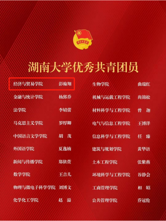 彭翰翔同学获评“优秀共青团员”称号