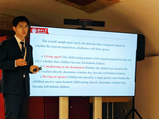 学生毕宗盛以学术嘉宾参会,并汇报了由舒扬老师指导的团队合作的学术论文《The “Benevolent” Employment-Effect of Digital Transformation: Does It Reduce Children Left Behind?》,该论文由李易展、刘晨阳、张子旭、庄美云共同撰写完成。汇报中,毕宗盛与伦敦国王学院教授、“中国研究院”主任Kerry Brown先生就论文涉及的研究领域进行了深入探讨,论文获得参会嘉宾的高度肯定。