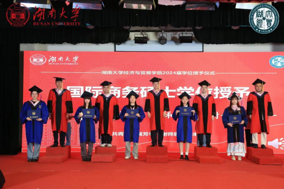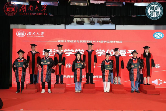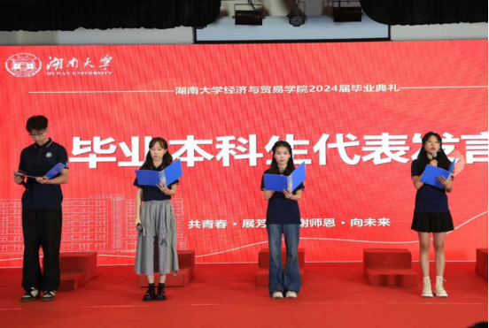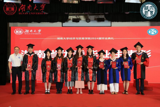 党委常委、校长助理许和连教授为省优秀毕业生颁发证书。研究生毕业生代表唐斌、本科生毕业生代表丁文婧、赵子妍、王界哲、黄宏柳上台发言,分享自己在湖大的成长历程,表达了对学校和学院的感激之情。