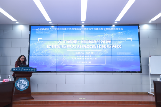 民建省委会副主委、长沙理工大学电气与信息工程学院常务副院杨洪明教授以“人工智能+能源融合发展助推新型电力系统数智化转型升级” 为题作主旨演讲。从湖南省新型电力系统构建过程中面临的挑战、融合人工智能关键技术着力打造数智化电力系统、构建面向智能化改造技术的人-资金-平台发展体系三个方面展开了深入分享。