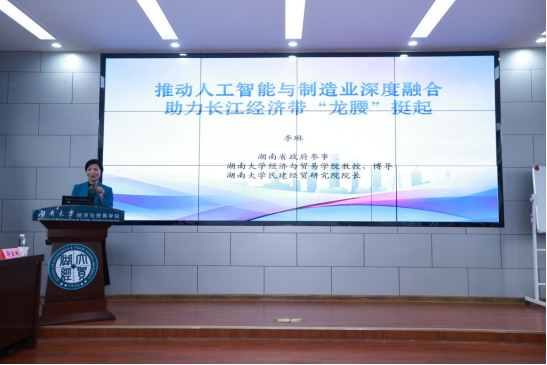 区域经济研究中心主任李琳教授以“推动人工智能与制造业深度融合助力长江经济带‘龙腰’挺起”为题作主旨演讲。从人工智能与制造业深度融合相关背景、面临的主要问题、推进长江中游人工智能与制造业深度融合的对策建议等方面进行主旨演讲。