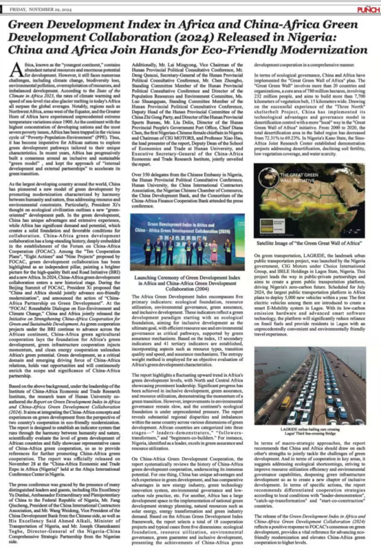 《非洲绿色发展指数与中非绿色发展合作报告(2024)》的发布是对中非合作论坛关于绿色发展共识的积极响应,为深入理解中非携手推进生态友好的现代化提供了重要参考,对促进中非绿色发展合作迈上更高质量台阶提供了新的思路。