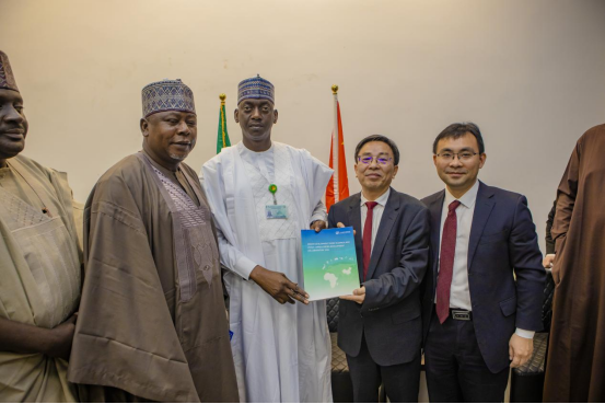 教授肖皓(右一)将报告送给尼日利亚国民议会众议院-尼中关系委员会主席贾法鲁