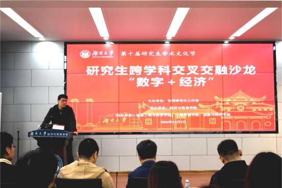 近日,研究生跨学科交叉交融沙龙第二期在财院校区行政楼201举行。特别邀请长沙市数据局副局长吴进、信息科学与工程学院教授荣辉桂、吉林大学长沙汽车创新研究院副院长赵军、北京大学长沙计算与数字经济研究院主任助理白曾鼎、金融与统计学院硕士研究生丁怡帆等五位师生以“数字+经济”为话题开展交流。本次沙龙由色情漫画