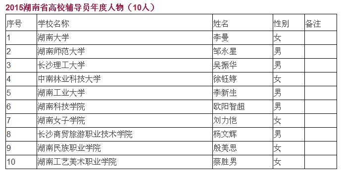 本次评选,经各高校推荐,省教育厅组织专家进行初推,并组织入围者进行了答辩,共推举出“2015湖南省高校辅导员年度人物”10名,“2015湖南省高校辅导员年度人物”提名奖20名。