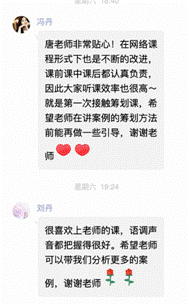 “唐老师人很温柔,每次课前都会给大家提供一些生活以及学习方面的规划。老师也很认真负责,税收策划课也是上的最精神的一节课。”“税收策划课很实用,里面教导的知识以后都能用到。老师也很温柔耐心,给我们学习、生活的建议,非常喜欢!”