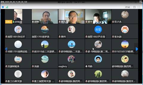 经贸学院党委书记郭平教授做总结发言,他认为当前在全球经济受疫情极大冲击的背景下讨论新冠疫情对外贸的影响具有重要的理论和现实意义,希望广大教工党员和学生党员要积极消化吸收专家和企业家们的真知灼见,转化为实际行动,为国家抗疫做出自己的贡献。同时表示,这样的活动,既是很好的主题党日活动,也是很好的学术交流与碰撞,同时在特殊时期以灵活多样的方式开展通支部主题党日活动,通过线上交流,效率更高,参与范围更大,可以在今后的党建活动中进一步进行探索和推广。