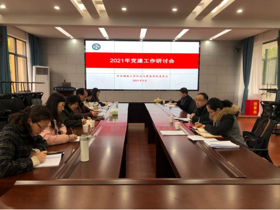 在经贸大楼201会议室召开2021年学院党建工作研讨会,学院党委书记祝树金主持,学院党委副书记李曼、副处级组织员刘周平、全体教工党支部书记和辅导员参会。