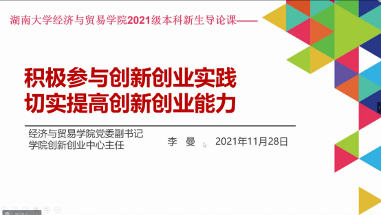 举行本科生2021级新生导论课之创新创业专题讲座。根据疫情防控要求,本次大会采取线上会议的方式举行,由院党委副书记、院创新创业中心主任李曼老师主讲,2021级本科生辅导员胡煊赫主持,全体经贸院本科2021级学生参与。