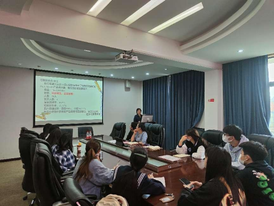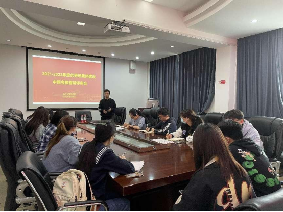 2021-2022年度优秀班集体建设中期考核答辩评审会顺利召开,会议由院学工办主任蔡婕萍老师主持,院党委副书记李曼老师、院团委书记肖遥老师、2021级辅导员胡煊赫老师以及优秀班集体立项班级的班委参加会议。