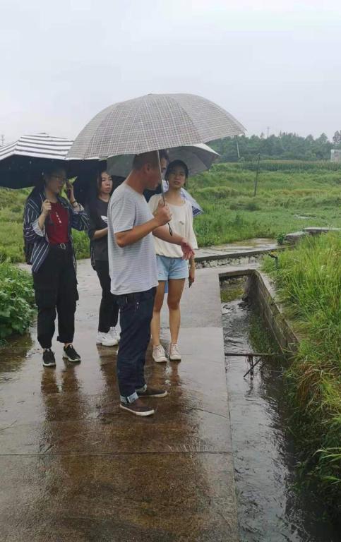 第二站,刘兰馨一行来到石子坳村。相较于陈家桥村,石子坳村村居居住较零散,村中青壮年人普遍外出务工,田地大多荒废,是一类空心农村的代表。在此类“空心村”中,水利设施建设基本只有排涝一种用途,对于农耕生产等方面的帮助不大,也导致了当地耕作的经济效益太小,越来越多的青年人选择弃耕务工,空心化趋势严重。了解到此类现状,团队成员们不仅陷入思考:“空心村”要如何发挥自身优势,突破目前的瓶颈,实现乡村振兴?