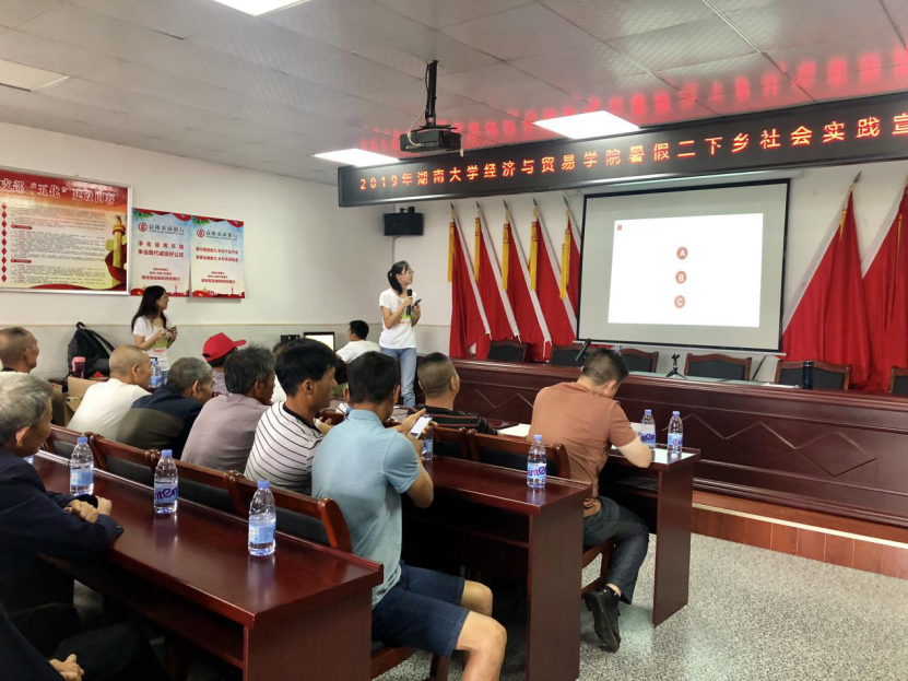 新经贸青年宣讲组则充分准备了党的十九大以来的主要理论政策、支付安全和防诈骗知识,为当地村民带来新思想、新知识的普及,现场活动气氛热烈,同学们通过演讲、朗读、知识竞赛等方式与村民互动,获得村民们的肯定与掌声。组内的学生党员还与当地党员进行采访,倾听基层党员故事,为基层党员尽心帮扶贫户、舍身处理猪疫等故事动容,深刻感受到“一心为公仆”的党心,更加坚定了为人民群众服务的信念。