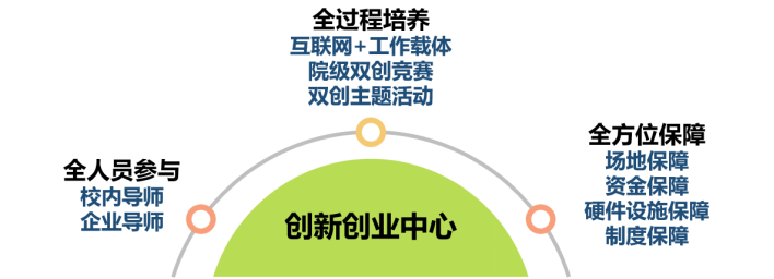 在坚持立德树人根本任务的过程中,“在创新创业中增长智慧才干”是对经贸人提出的最强烈的时代要求。不断推进双创育人,探索“思创融合”,着力提升学生的创新创业能力是学院党委工作中人才培养的重要创新点。学院创新创业中心是学院人才培养中“两中心三平台”创新实践重要载体之一,形成了创新教育全人员参与、全方位保障、全过程培养的 “三全”工作网格,做到对学生的创新意识有引导,创新活动有平台,创新想法有指导,创新实践有场地,创新成果能转化。