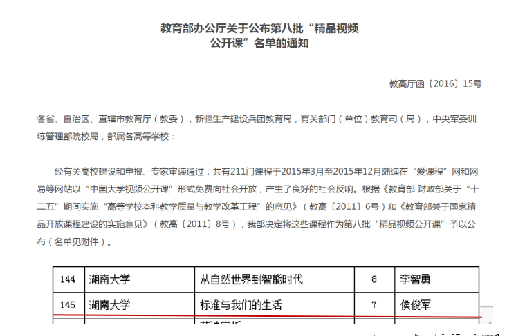 《标准与我们的生活》荣获教育部第八批“精品视频公开课”