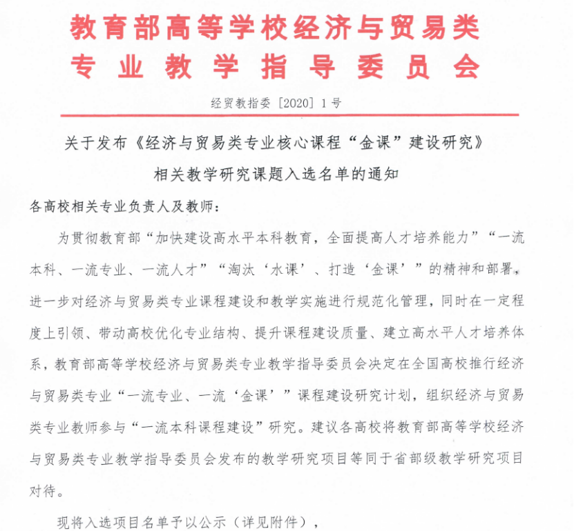教育部经济与贸易类专业核心课程“金课”建设研究相关教学研究课题公示
