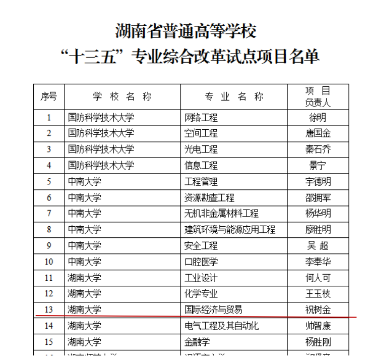 双一流专业建设工作成果显著。国际经济与贸易专业获批湖南省普通高校“十三五”专业综合改革试点项目。在教育部公布的“2019年度国家级和省级一流本科专业建设点名单”中,学院申报的国际经济与贸易专业和经济学专业分别入选国家级一流本科专业建设点和省级一流本科专业建设点。
