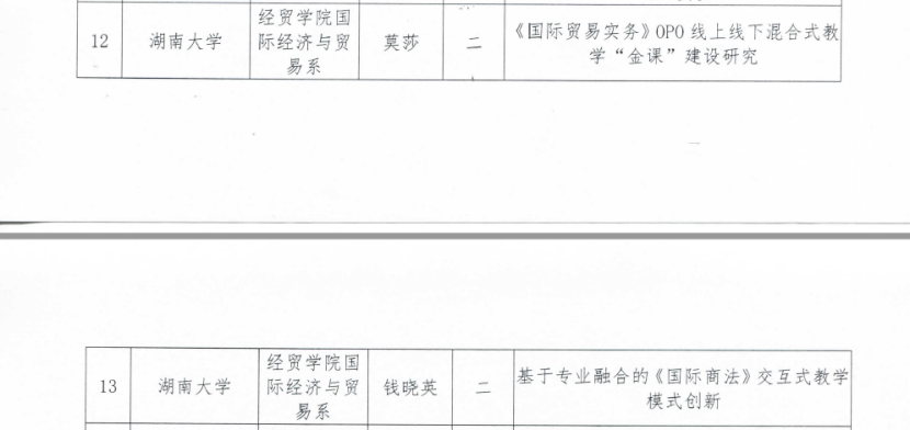 学院党委不断提高学院专业课程教学质量,深化教育教学改革。2016年至今,侯俊军教授的《标准与我们的生活》荣获教育部第八批“精品视频公开课”、《国际贸易与标准》获2017年国家精品在线开放课程;莫莎老师的《国际贸易实务》获湖南省省级精品在线开放课程;国贸党支部书记莫莎老师的《《国际贸易实务》0P0线上线下混合式教学“金课”建设研究》与钱晓英老师的《基于专业融合的《国际商法》交互式教学模式创新》2个教学与研究课题,入选教育部高等学校经济与贸易类专业教学指导委员会评定的经济与贸易类专业核心课程“金课”建设研究相关教学研究课题。