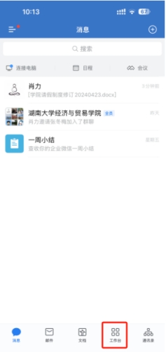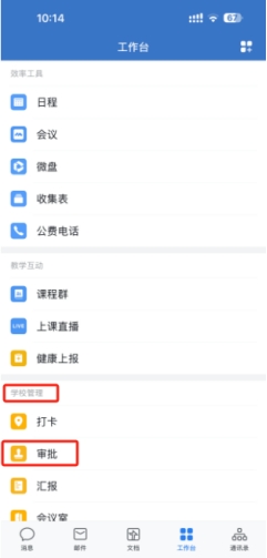 三、回到主页面,选择工作台,点击学校管理栏目中的审批,进入“发起申请”页面