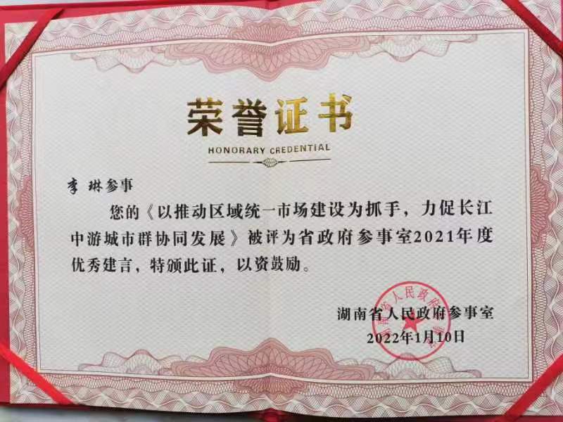 在优秀建言表彰中,李琳参事负责的《聚集短板分类施策推动我省县域经济高质量发展》《以推动区域统一市场建设为抓手,力促长江中游城市群协同发展》分别被列入年度四大重点课题和参事建言专报。