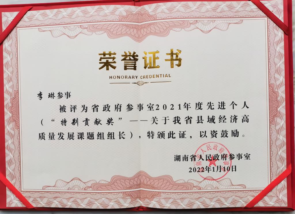 在先进个人表彰中,李琳参事作为参事室年度四大重点课题组长,牵头了我省县域经济高质量发展课题工作,被授予“特别贡献奖”。