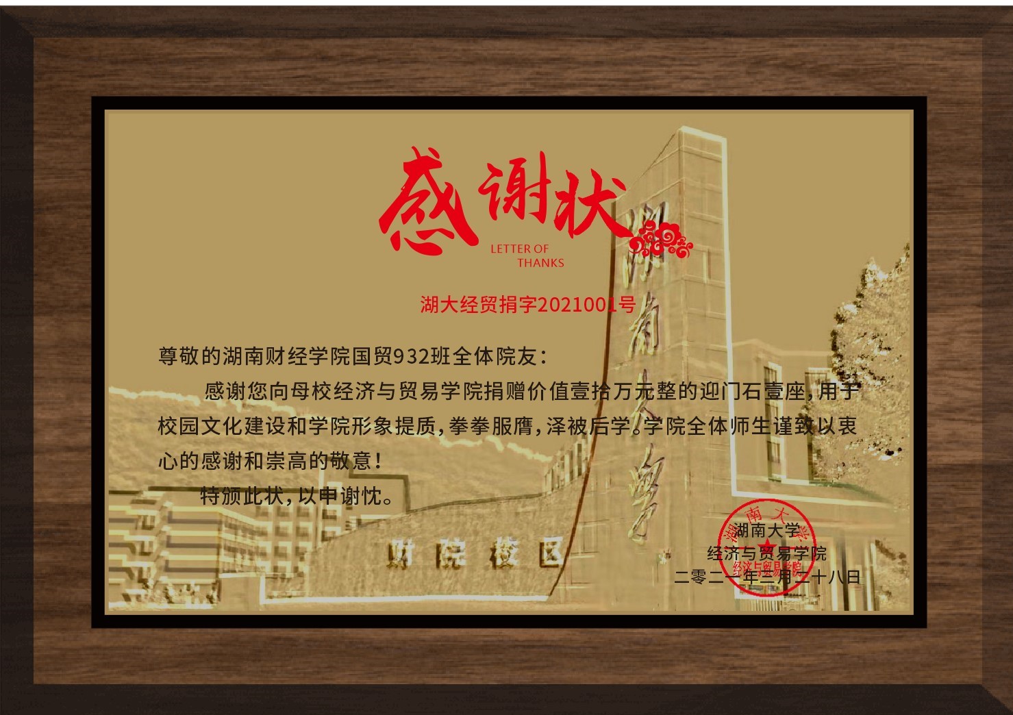 ”熠熠生辉。捐赠校友代表——湖南财经学院国贸932班院友黄炜、秦峰、邱琼等一行8人代表全班39名校友返校参加仪式。院长侯俊军、党委书记祝树金、副书记李曼、校友工作负责人刘周平、院办主任肖力出席仪式。仪式由校友工作负责人刘周平主持。